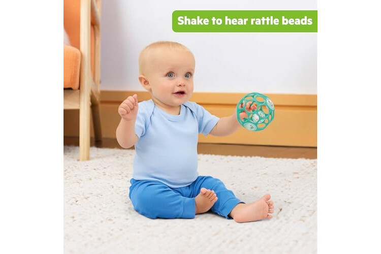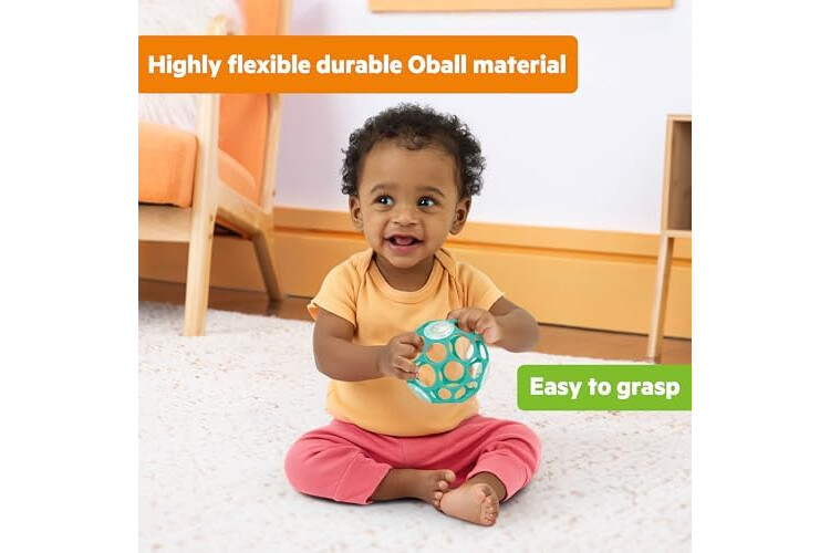 Grasp the flexible Oball for fine motor skill development and tactile stimulation; shake the ball to engage auditory senses and engage in exciting cause-and-effect play