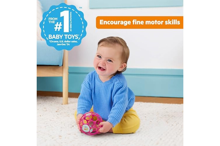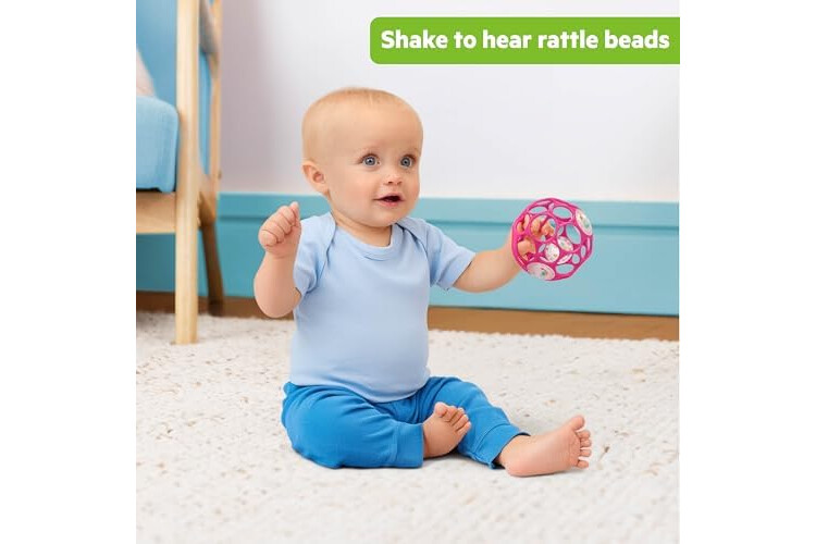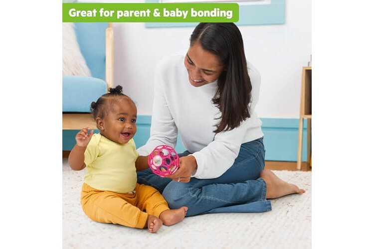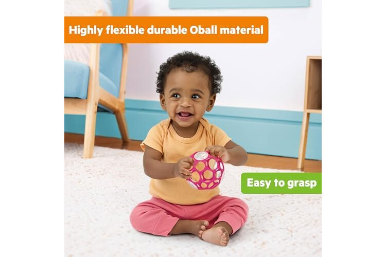 Grasp the flexible Oball for fine motor skill development and tactile stimulation; shake the ball to engage auditory senses and engage in exciting cause-and-effect play