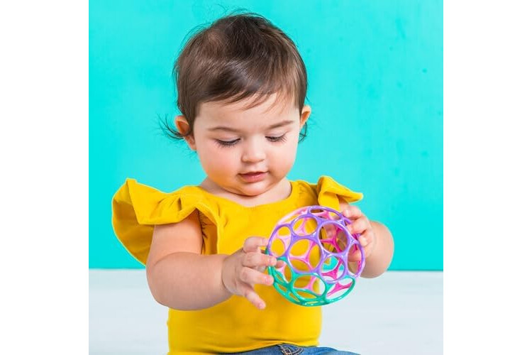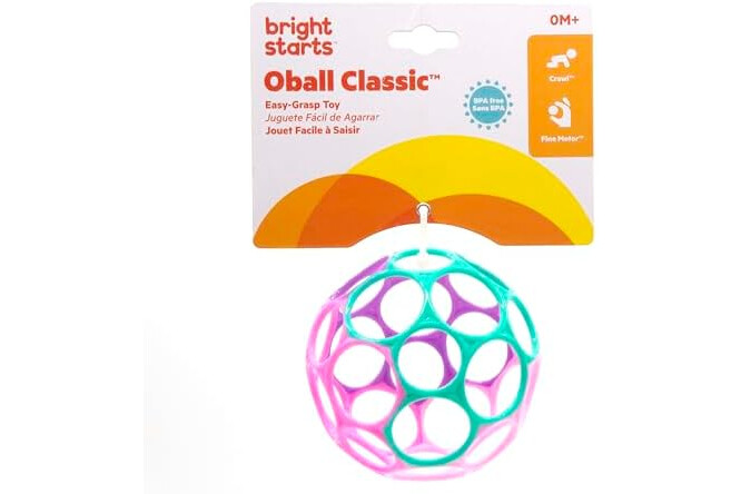 Bright Starts Oball is a fan-favorite toy ball that has been engaging tiny fingers for over 25 years; flexible design features large finger holes to help baby easily grip and explore