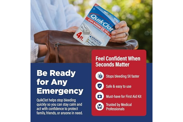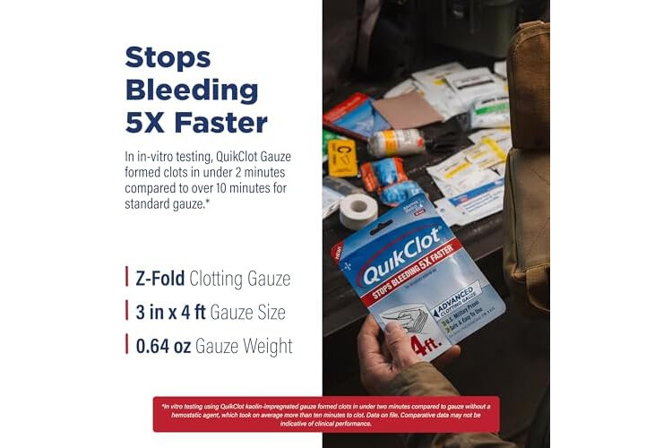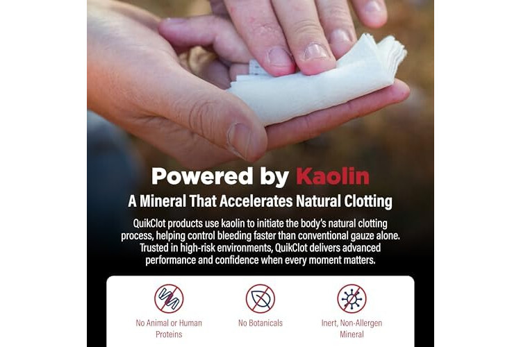Stop Bleeding Fast: Control bleeding with QuikClot hemostatic gauze, which acts to stop bleeding 5 times faster; gauze is impregnated with kaolin, a mineral that accelerates natural clotting process