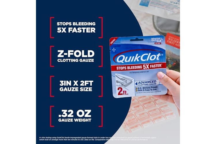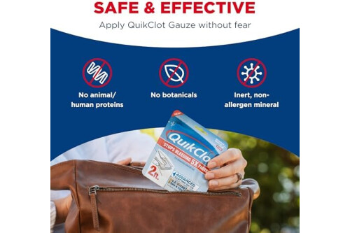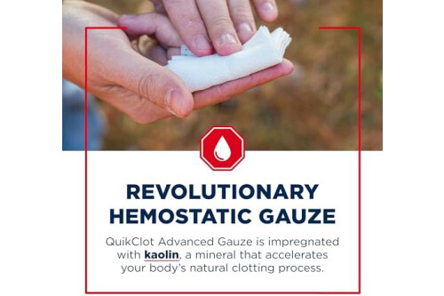 Stop Bleeding Fast: Control bleeding with QuikClot hemostatic gauze, which acts to stop bleeding 5 times faster; gauze is impregnated with kaolin, a mineral that accelerates natural clotting process