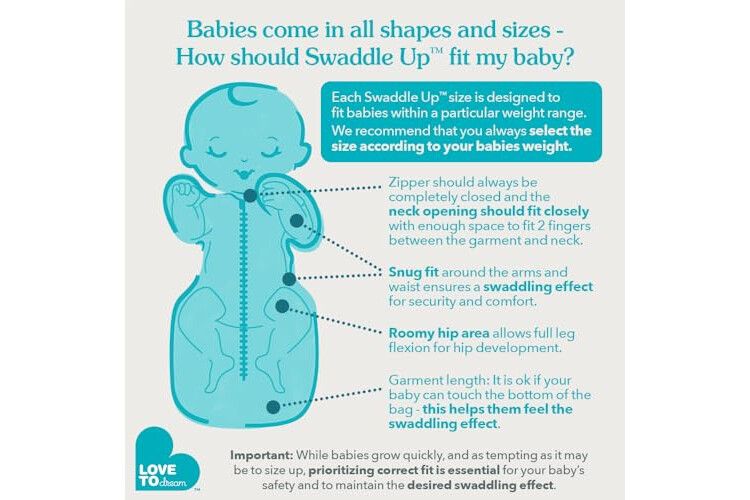 πππππ ππππ = ππππππ πππππ: Choose the SIZE M (MEDIUM) Swaddle UP baby sleep sack made for 13 β 19 lbs and up to 68 cm / 27 in. Tap the size chart to confirm weight and height, then buy with confidence. The right weight-based fit keeps this arms-up sleep sack snug at the shoulders while hips stay free, stops fabric creeping over faces, reduces returns, and lets every tired parent enjoy longer, safer sleep night after night
