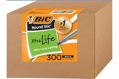 BIC Round Stic Xtra Life Ballpoint Pens, Bulk Pack of Black Ink Pens, Medium point 1.0 mm, Pack of 300