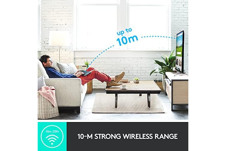 Wireless Freedom: Designed for seamless comfort and control, this HTPC keyboard boasts a range of up to 33 ft (1) wireless connectivity, with quiet keys and a large touchpad for easy navigation