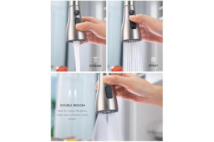 【Versatile Spray Modes】--- 3 Modes Spray - The utility basin faucet with STREAM, SPREY and DUAL BROOM whether you need a powerful spray and broom for tough cleaning, or a gentle stream for daily cleaning, this kitchen faucet with sprayer protects you and offers flexibility for a variety of kitchen work. Effortlessly switch between modes to suit your needs