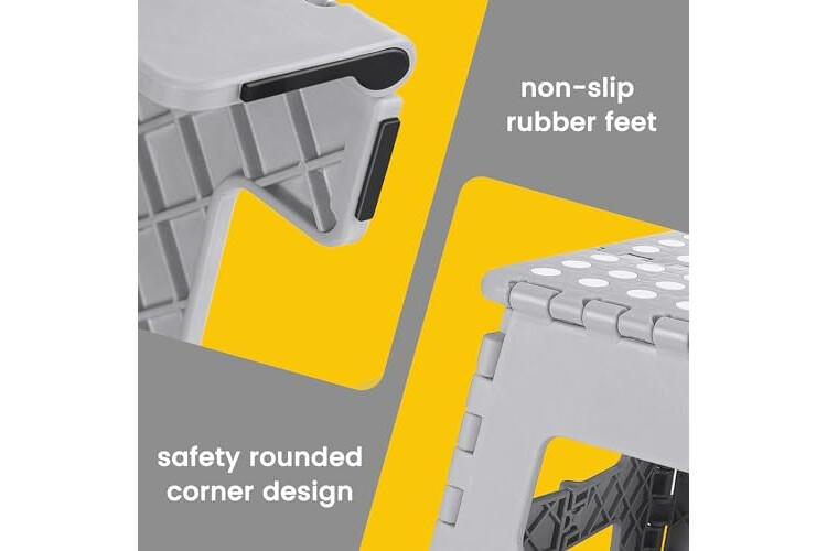 Corner Protection & Anti Slip: Professional safety rounded edge protection prevents children and the elderly from being injured in the event of a collision. Our folding stool has non-slip black rubber straps on all four feet for superb grip and to prevent slipping. So it is a perfect companion in the bathroom and kitchen.