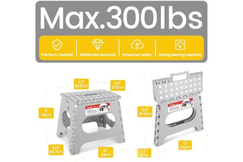 Details & Dimensions: The stepping stool is compact at 11"H×11.2"L×8.5" W when opened and 15"H ×13"L×1.7" W when folded. Anyone wearing a shoe size 16 or less can stand up fully on bot...