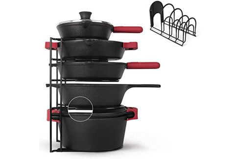 5 TIER HEAVY DUTY CONTRUCTION - No more buckling under the weight! These heavy duty organizers can handle up to 50-lbs of cast iron cookware or even the highest gauge metal cookware. Along with the innovative food-grade silicone-coated wire shelves, you can be confident in the function of this great looking rack!