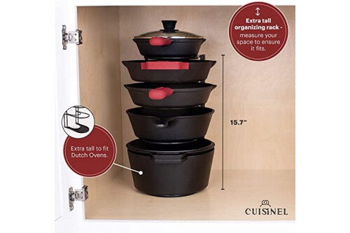 EXTRA LARGE TO FIT A DUTCH OVEN: This extra large version conveniently fits a dutch oven pot on the lowest rack. It's heavy duty construction is designed to hold even your heaviest cast iron pans, the strong metal ensures your pan organizer will be a lifetime investment. Durable and built to last, this rack can handle anything!