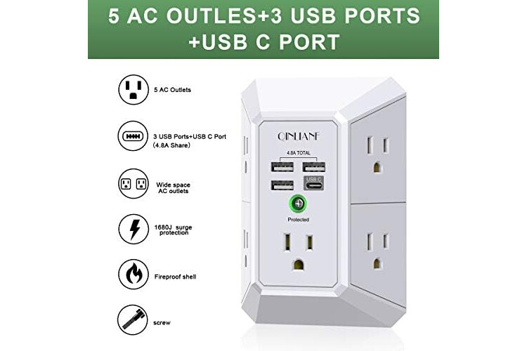 Wall Charger, Surge Protector, QINLIANF 5 Outlet Extender with 4 USB Charging Ports (4.8A Total) 3-Sided 1680J Power Strip Multi Plug Adapter Spaced for Home Travel Office (3U1C)