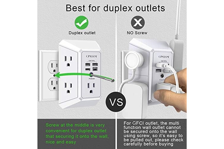 【 Multi Function USB Outlet】- Securing onto the wall design. Fit duplex outlet perfectly, just plug in to use. You get 5 AC outlet splitter (3 sides) with wide space in between; 4 USB charger ports; using the screw at the middle to secure it onto the wall for duplex outlet, so it is not pulled out when pulling the plugged in devices and loss power. Note: this works on duplex outlet only, other types of outlet like GFCI outlet cannot be secured onto the wall.Best Ideal Stocking Stuffers for Adults.