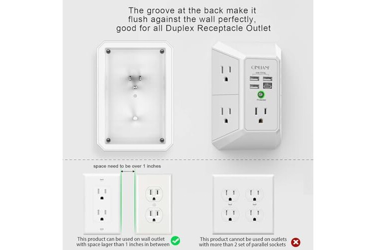 【The Groove Design on The Back and Wide space 】- 5 AC outlets with 2.1 inches long space in between, larger than standard 1.5-inch socket. Larger spacing makes it easier to use for all kinds of equipment. The groove at the back make it flush against the wall perfectly, good for all Duplex Receptacle Outlet. NOTE: This product can be used on wall outlet with space lager than 1 inches in between ,This product cannot be used on outlets with more than 2 set of parallel sockets.