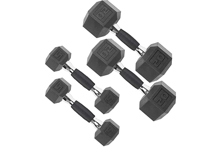 FEATURES – Includes 5lb and 20lb pair of coated dumbbells with Comfort handles; Hex-shaped ends prevent rolling; Medium-depth knurling on the handle provides essential grip and security during use; Comfort coated handle adds a stylish element to your home gym; Dumbbell end coating is extremely durable
