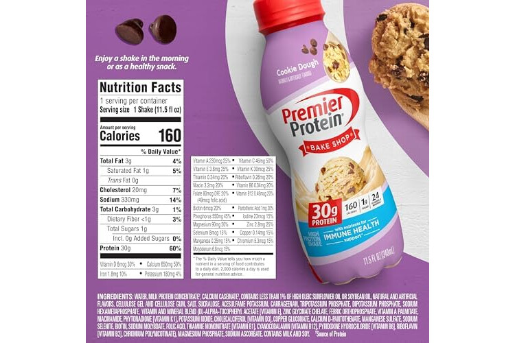 Premier Protein Shake, Cookie Dough, 30g Protein 1g Sugar 24 Vitamins Minerals Nutrients to Support Immune Health, 11.5 fl oz (Pack of 12)