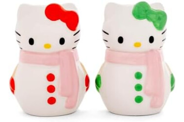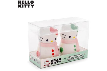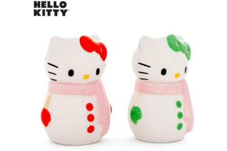 HELLO KITTY HOLIDAY: Shaker set features Hello Kitty in snowman form. One shaker is complete with a red bow, buttons, and mittens and the other is finished in green. Both shakers feature a pink scarf.