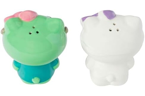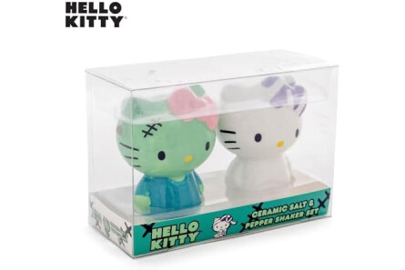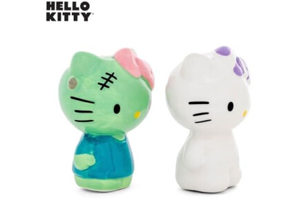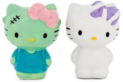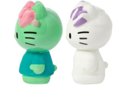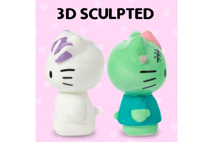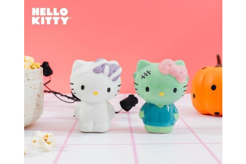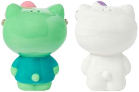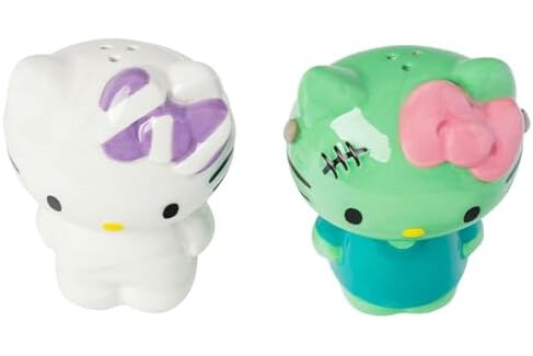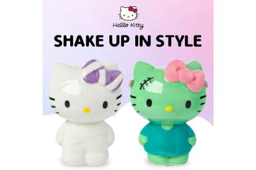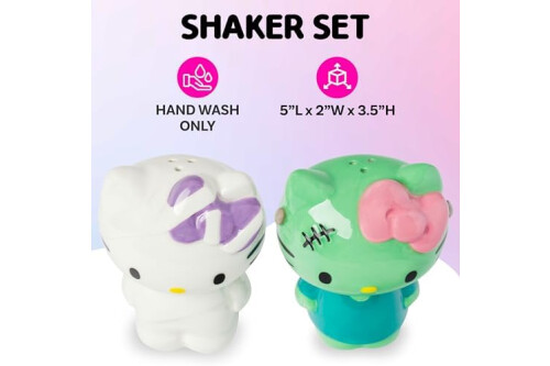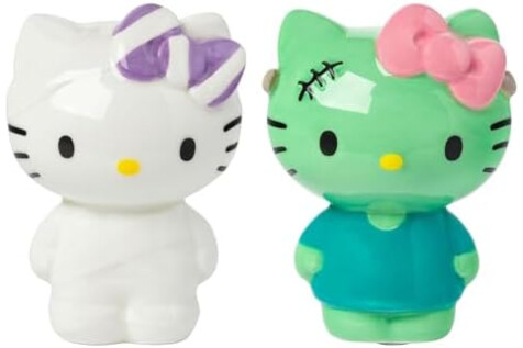 HELLO KITTY HALLOWEEN: Themed shaker set features Hello Kitty in two different costumes. One shaker features Hello Kitty in a Frankenstein costume with an adorable pink bow and the other shaker features Hello Kitty in a mummy costume with a purple bow.
