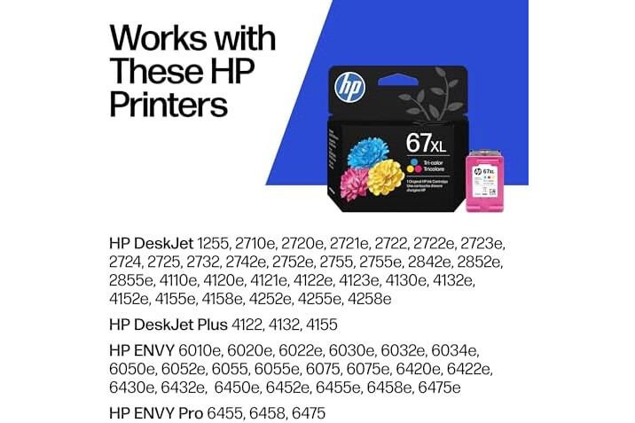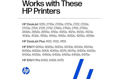 • This cartridge works with: HP DeskJet 1255, 2710e, 2720e, 2721e, 2722, 2722e, 2723e, 2724, 2725, 2732, 2742e, 2752e, 2755, 2755e, 4110e, 4120e, 4121e, 4122e, 4123e, 4130e, 4132e, 4152e, 4155e, 4158e; HP DeskJet Plus 4122, 4132, 4155