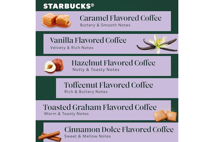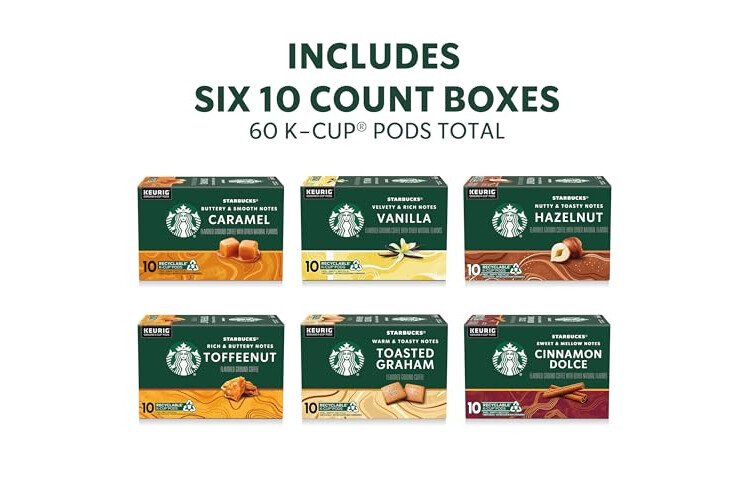 PREMIUM COFFEE IN A K-CUP POD: Enjoy the Starbucks coffee you love at home with six 10-count boxes of K-Cup pods—featuring Starbucks Caramel, Vanilla, Hazelnut, Toffeenut, Toasted Graham and Cinnamon Dolce Flavored Coffees—60 pods total