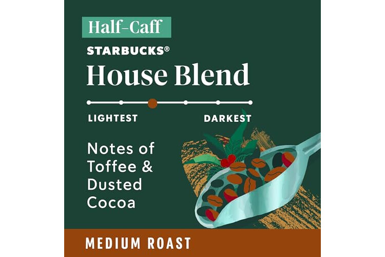 BALANCED: Starbucks Half-Caff House Blend is a well-rounded and medium-bodied blend of Latin American coffees with notes of toffee and dusted cocoa—making it approachable, smooth and oh, so delicious