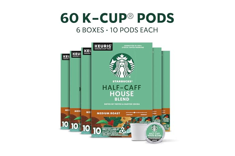 PREMIUM COFFEE IN A K-CUP POD: Enjoy the Starbucks coffee you love at home. These 6 boxes of 10 Starbucks Half-Caff House Blend Medium Roast K-Cup pods feature just enough caffeine and are designed for Keurig coffee makers—60 pods total