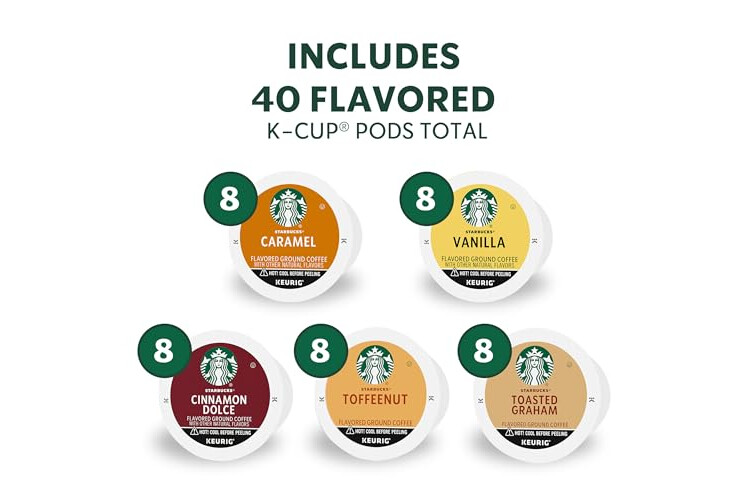 PREMIUM COFFEE IN A K-CUP POD: Enjoy the Starbucks coffee you love at home with a 40-count box of K-Cup pods—featuring Starbucks Caramel, Vanilla, Toasted Graham, Toffeenut and Cinnamon Dolce Flavored Coffees