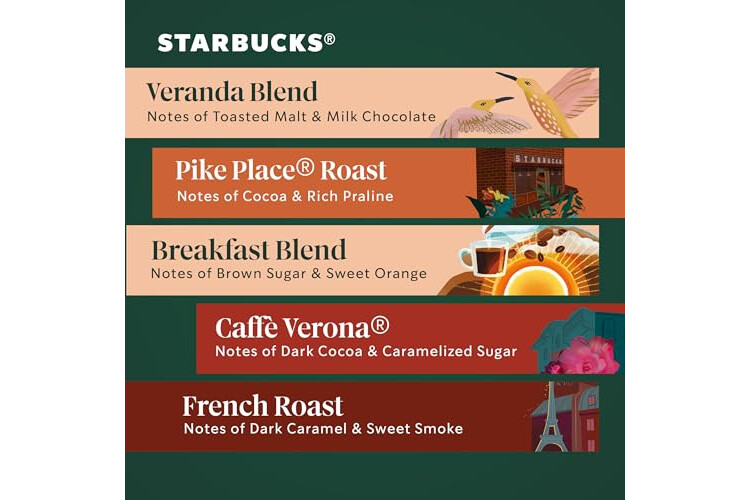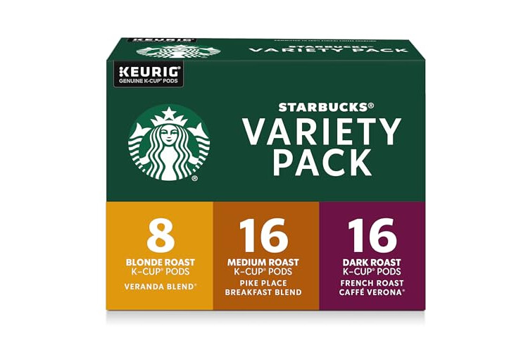 STARBUCKS VARIETY PACK—The Starbucks Blonde, medium and dark roast coffee variety pack includes Starbucks Veranda Blend coffee, Starbucks Pike Place Roast coffee, Starbucks Breakfast Blend coffee, Starbucks Caffè Verona coffee and Starbucks French Roast coffee