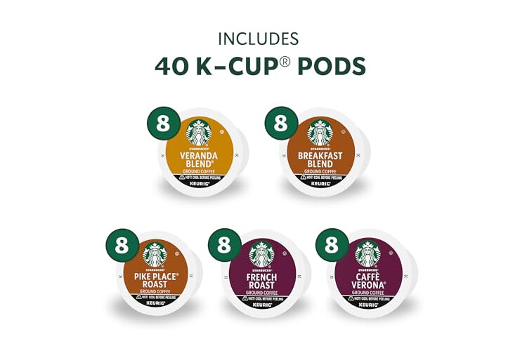 PREMIUM COFFEE IN KEURIG K-CUPS—Starbucks delivers exceptional coffee cup after cup with this variety pack of Starbucks Blonde, medium and dark roast coffee K-Cups—40 coffee pods for Keurig coffee makers