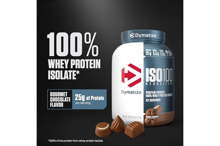 Dymatize ISO100 Hydrolyzed Protein Powder, 100% Whey Isolate Protein, 25g of Protein, 5.5g BCAAs, Gluten Free, Fast Absorbing, Easy Digesting, Gourmet Chocolate, 3 Pound (42 Servings)