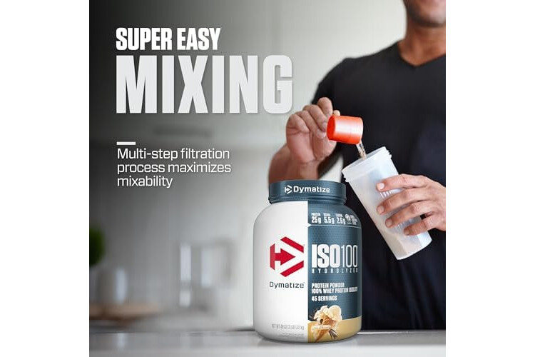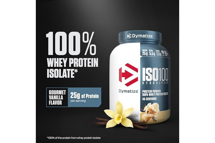 Dymatize ISO100 Whey Protein Powder Isolate, Vanilla, 25g of Protein, 3 Pound, 5.5g BCAAs, Less Than 120 Cal., Gluten Free, 1g Fat, 1g Sugar, 2g Carb (45 Servings)