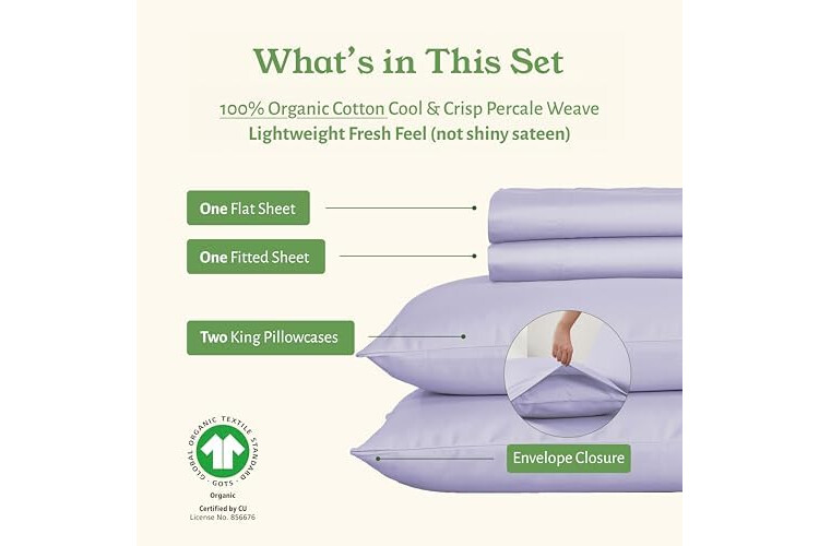 OUR SHEET SET HAS EARNED THE GOOD HOUSEKEEPING SEAL (GOTS Certified 100% Organic Cotton Sheet Set): Classic Percale Sheets. Gentle on skin, these organic king sheets cotton percale sets are made using 100% organic cotton percale fabric and offer a balance of crispness and breathability. These durable bed sheets have a beautiful matte finish and a crisp touch. Independently tested to earn the prestigious Good Housekeeping Seal.