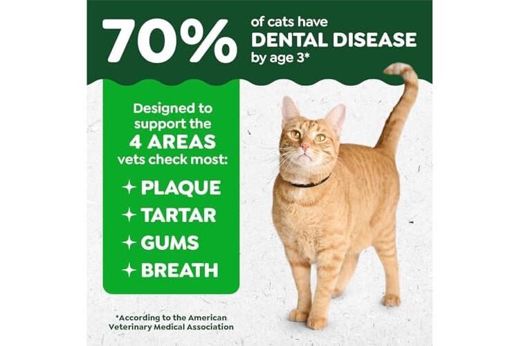 70% of cats have dental disease by the age of 3, according to the American Veterinary Medical Association. Start an oral care routine with Feline Greenies Adult Dental Cat Treats, designed to support the 4 areas veterinarians check most: plaque, tartar, gums, & breath. The #1 veterinarian-recommended cat dental treats will help you tackle cat bad breath with 36% less tartar accumulation in 28 days (Data on file). These cat treats have a unique design that works like a toothbrush to clean down to the gumline to support cat dental care. These dental treats for cats are made with natural ingredients plus vitamins, minerals & nutrients. With less than two calories per cat dental treat, Greenies Dental Cat Treats allow you to treat with confidence. Also, the irresistible taste of this tempting tuna-flavored cat dental treat will delight even finicky felines. Make Health A Treat!