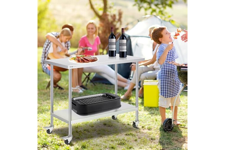 Stable and Durable: With an upgraded thickness of 0.8mm, this table is sturdy and durable, providing ample storage for your supplies and allowing you to stack your favorite ingredients easily. Equipped with 4 swivel casters, including 2 with brakes, the table remains stable and can be easily moved to any location.