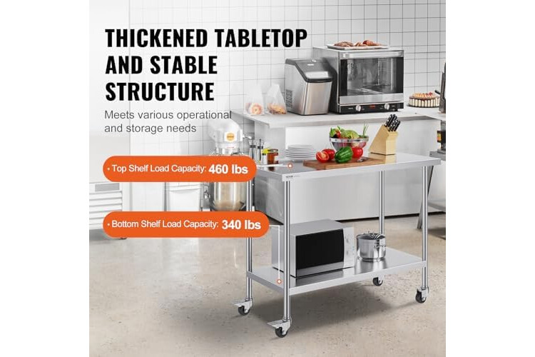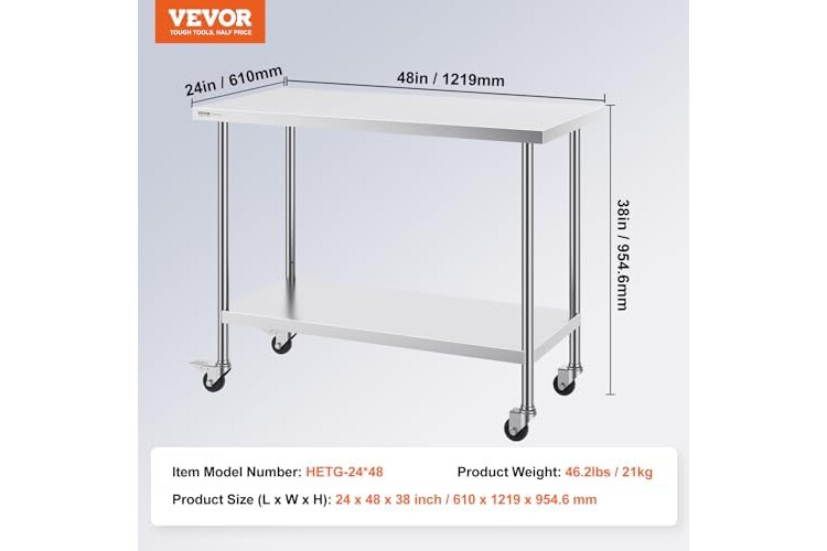 VEVOR Stainless Steel Work Table 24 x 48 x 38 Inch, with 4 Wheels, 3 Adjustable Height Levels, Heavy Duty Food Prep Worktable for Commercial Kitchen Restaurant, Silver