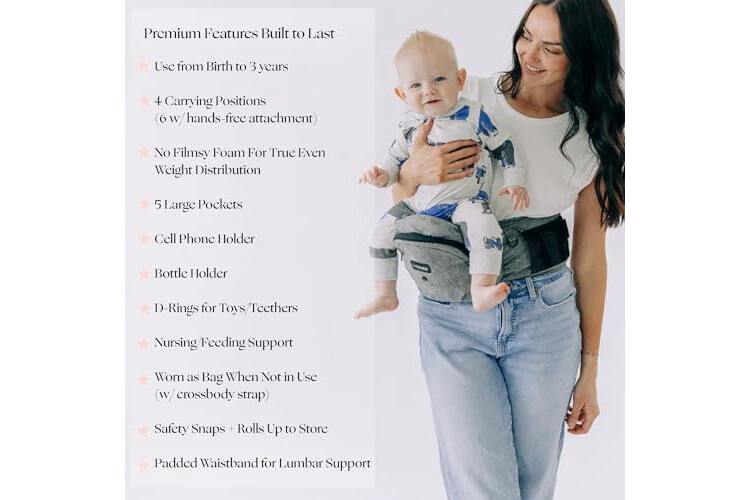 • Hip Seat Support: Ergonomic seat carries babies and toddlers up to 45 lbs, shifting weight to hips and lower back instead of shoulders