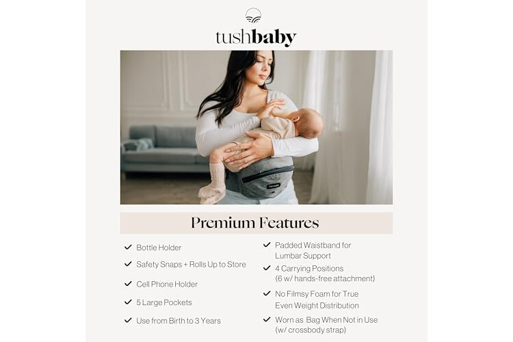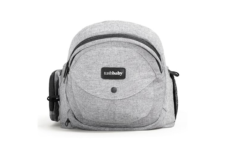 Tushbaby Original Hip Seat Baby Carrier for Babies & Toddlers up to 45 lbs, Safety Certified, Lightweight No-Foam Design with Storage, Grey