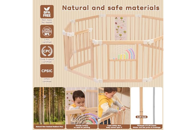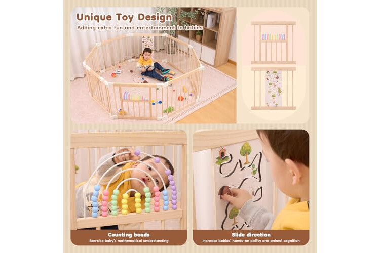 【Unique Design】The wooden playpen panel has built-in toys, and our baby can play in the play pen, adding extra fun and entertainment to the baby. The transparent design of our baby baby play pen allows you to observe your baby's every move while solving problems. Our baby fence can ensure that your baby stays safe and entertained.
