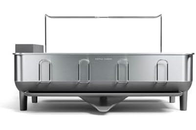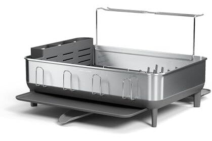 simplehuman Large Capacity Dish Drying Rack with Stainless Steel Frame, 360º Easy Drain Swivel Spout, Utensil & Wine Glass Holder, Anti-Residue Coating, Moisture Control Surface, Grey