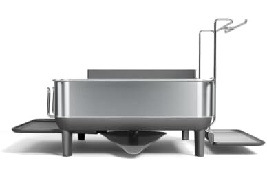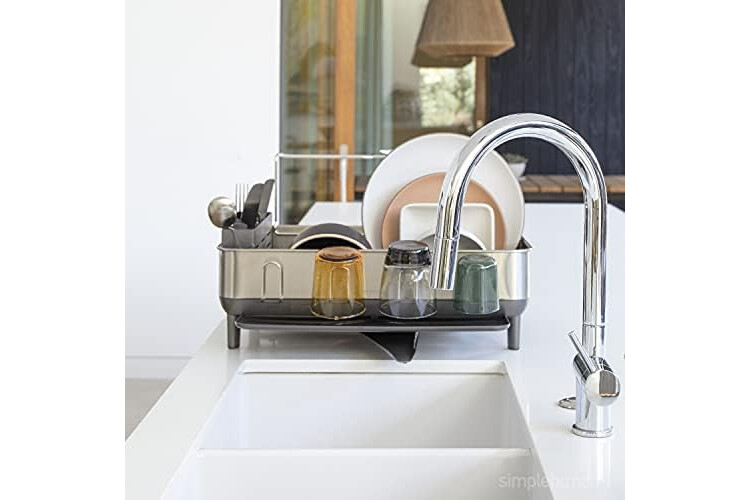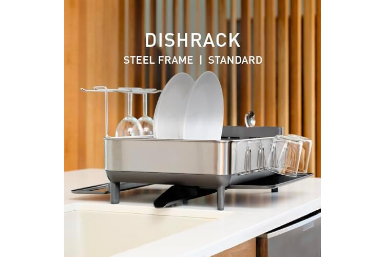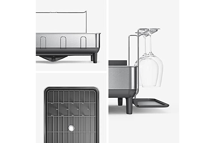 YOU WASH, I'LL DRY - simplehuman's steel frame dishrack has an innovative drainage system that includes an integrated drip tray with a swivel spout that pivots to keep water flowing directly into the sink, not onto the countertop.