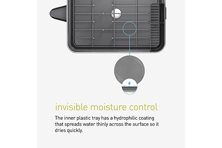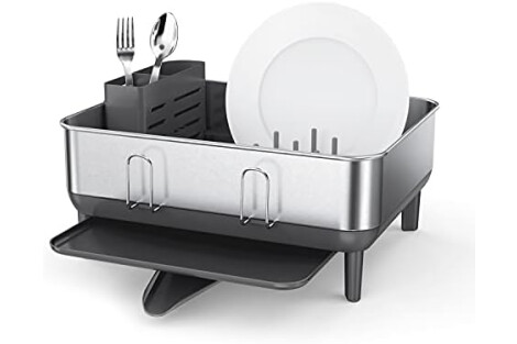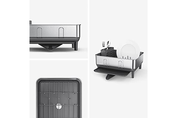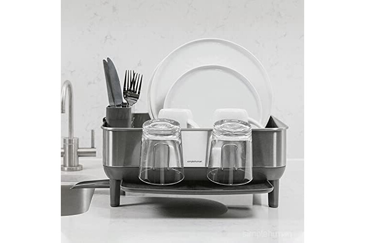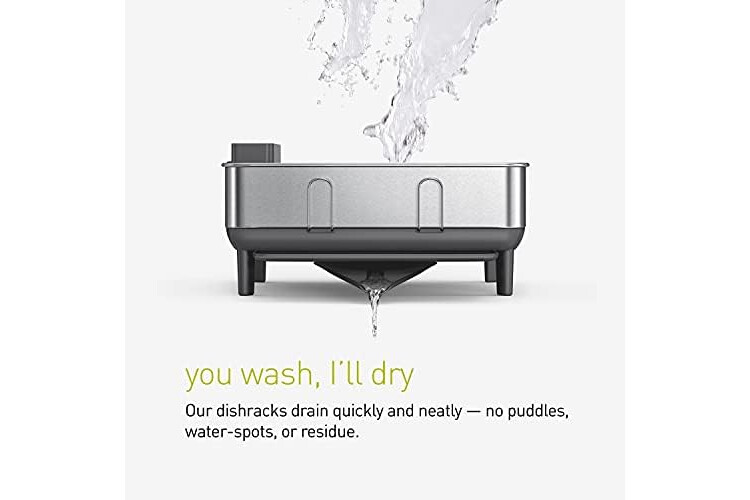 YOU WASH, I'LL DRY - simplehuman's compact steel frame dishrack has an innovative drainage system that includes an integrated drip tray with a swivel spout that pivots to keep water flowing directly into the sink, not onto the countertop.