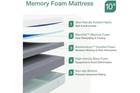 PAIN RELIEF & WAKING UP REFRESHED: The 4-layer foam design of the mattress helps relieve pain and improve sleep quality. As you lie on the cal king memory foam mattress, the gel-infused foam layer contours to your body, providing relief around pressure points such as hips and shoulders. Simultaneously, the comfort layer enhances foam mattress's bounce, preventing sinking while you sleep.