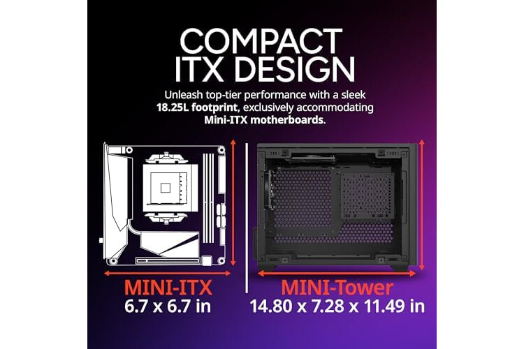 Compact ITX Design: Unleash top-tier performance with a sleek 18.25L footprint, exclusively designed to accommodate Mini-ITX motherboards.