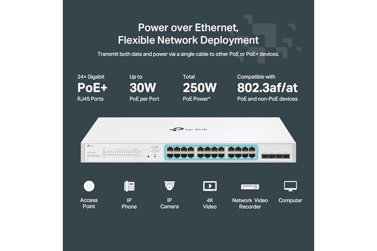 ๐ ๐ฅ๐๐ฑ๐ข๐๐ฅ๐ ๐ ๐ฎ๐ฅ๐ฅ ๐๐ข๐ ๐๐๐ข๐ญ ๐๐-๐๐จ๐ซ๐ญ ๐๐จ๐ ๐๐จ๐ง๐๐ข๐ ๐ฎ๐ซ๐๐ญ๐ข๐จ๐ง - 24 ร PoE+ (802.3at/af) 10/100/1000 Mbps RJ45 ports providing up to 30W per port and total PoE power budget of 250W, together w/ 4ร Gigabit SFP slots for high-speed connections.
