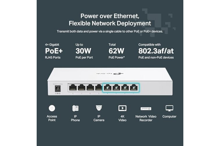 ๐ ๐ฅ๐๐ฑ๐ข๐๐ฅ๐ ๐ ๐ฎ๐ฅ๐ฅ ๐๐ข๐ ๐๐๐ข๐ญ ๐ ๐๐จ๐ซ๐ญ ๐๐จ๐ ๐๐จ๐ง๐๐ข๐ ๐ฎ๐ซ๐๐ญ๐ข๐จ๐ง - 4 ร PoE+ (802.3at/af) 10/100/1000 Mbps RJ45 ports providing up to 30W per port and total PoE power budget of 61W, together w/ 4x Gigabit Non-PoE Ports for high-speed connections.