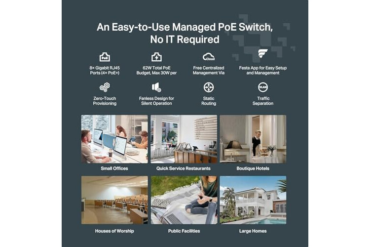 TP-Link Festa FS308GP 8 Port Gigabit Smart Managed PoE Switch 4 PoE+ Port @62W Self-Organizing Network Free Cloud Control Fanless Static Routing, Vlan, ACL, LAG Does not Work with Omada