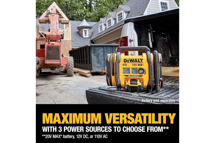 Three power sources for inflation on this tire air pump: 20v max battery, 12v dc, or 110v ac