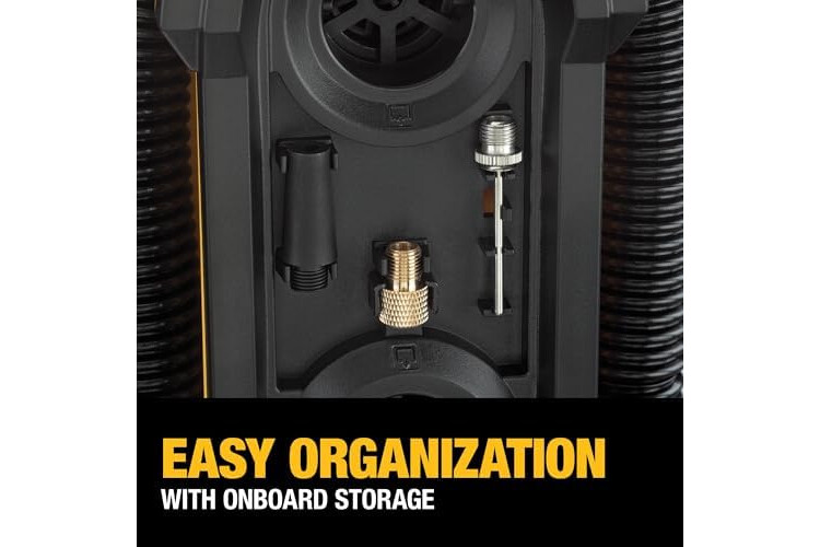 Convenient onboard accessory storage. Heavy-duty rubber feet help reduce walking when in use ideal for a car pump, bike pump and digital tire inflator