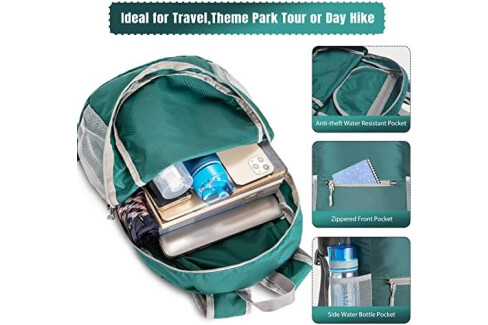 20L ULTRA LIGHTWEIGHT FOLDABLE BACKPACK: Our packable hiking backpack water resistant capacity is 20L,the pocket distribution is reasonable,and items are stored in an orderly manner.The main bag is stored clothings,and tourist guidelines in inner partitions.One front bag stores small equipment such as mobile phones,mobile power supply,and two side bags store umbrellas,water bottles or sunglasses.Our small foldable backpack meets the needs of carrying lightweight items