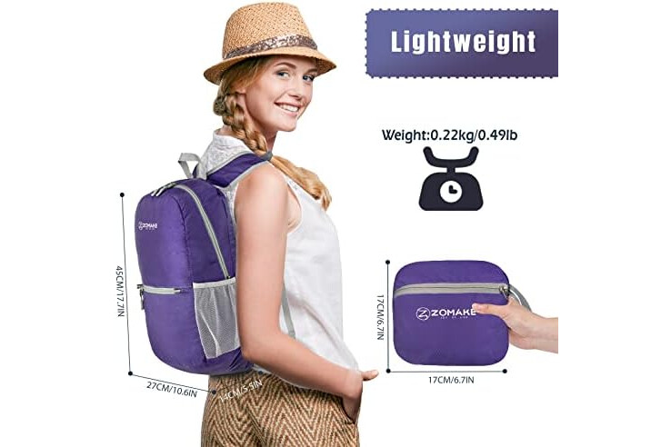 0.5 POUNDS OF PORTABLE ULTRA LIGHTWEIGHT PACKABLE BACKPACK: The size of the travel backpack packable is 17.71 x5.5x 10.6 inches,and the folding size is 6.7 x 6.7 x 1.97 inches.The lightweight foldable backpack is an ideal luggage bag for a plane.When it is not used,fold it into a compact pocket (sandwiches size).It can be stored in anywhere in pockets,luggage,handbags,etc