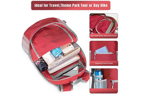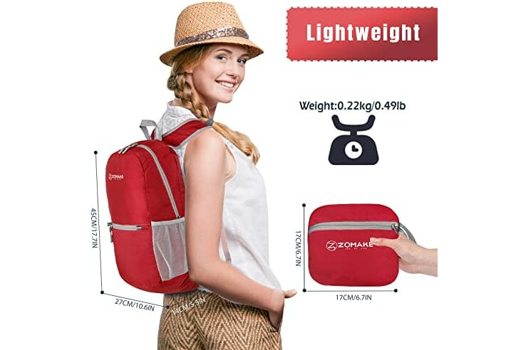 0.5 POUNDS OF PORTABLE ULTRA LIGHTWEIGHT PACKABLE BACKPACK: The size of the travel backpack packable is 17.71 x5.5x 10.6 inches,and the folding size is 6.7 x 6.7 x 1.97 inches.The lightweight foldable backpack is an ideal luggage bag for a plane.When it is not used,fold it into a compact pocket (sandwiches size).It can be stored in anywhere in pockets,luggage,handbags,etc