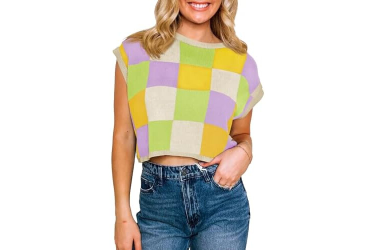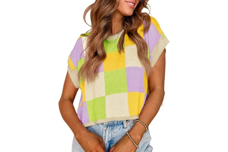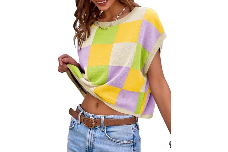 Saodimallsu Womens Cap Sleeve Crop Tops Summer Color Block Going Out Crew Neck Knit Trendy Casual Sweater